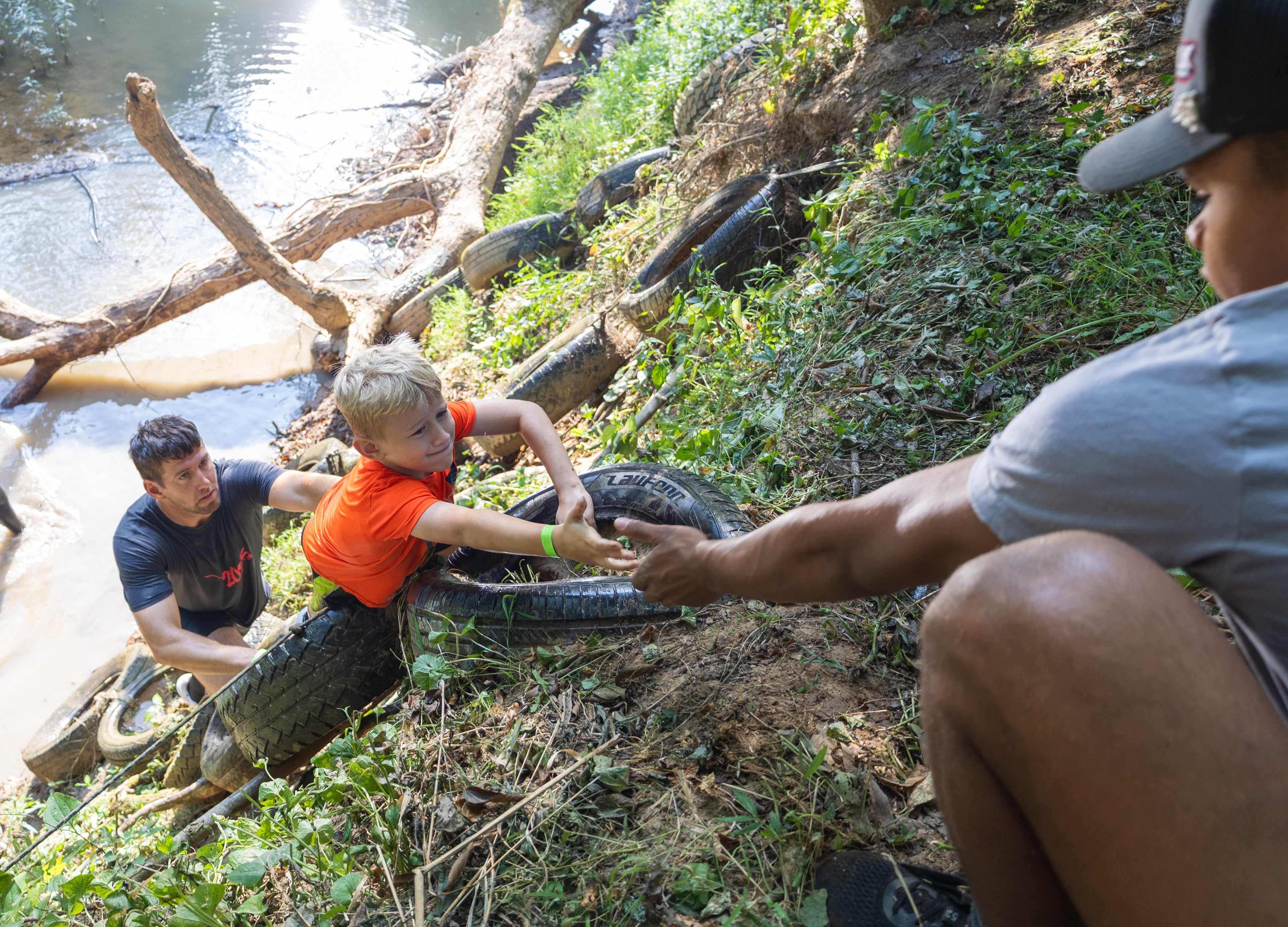 Charles Spice 34 helps lift up his son from below Maddox 7, as Malachi Schoenecke a helper gives his hand from the top on the ninth obstacle at the annual Bowling Green Mud Run on Saturday, Aug. 23, 2025, at Phil Moore Park.