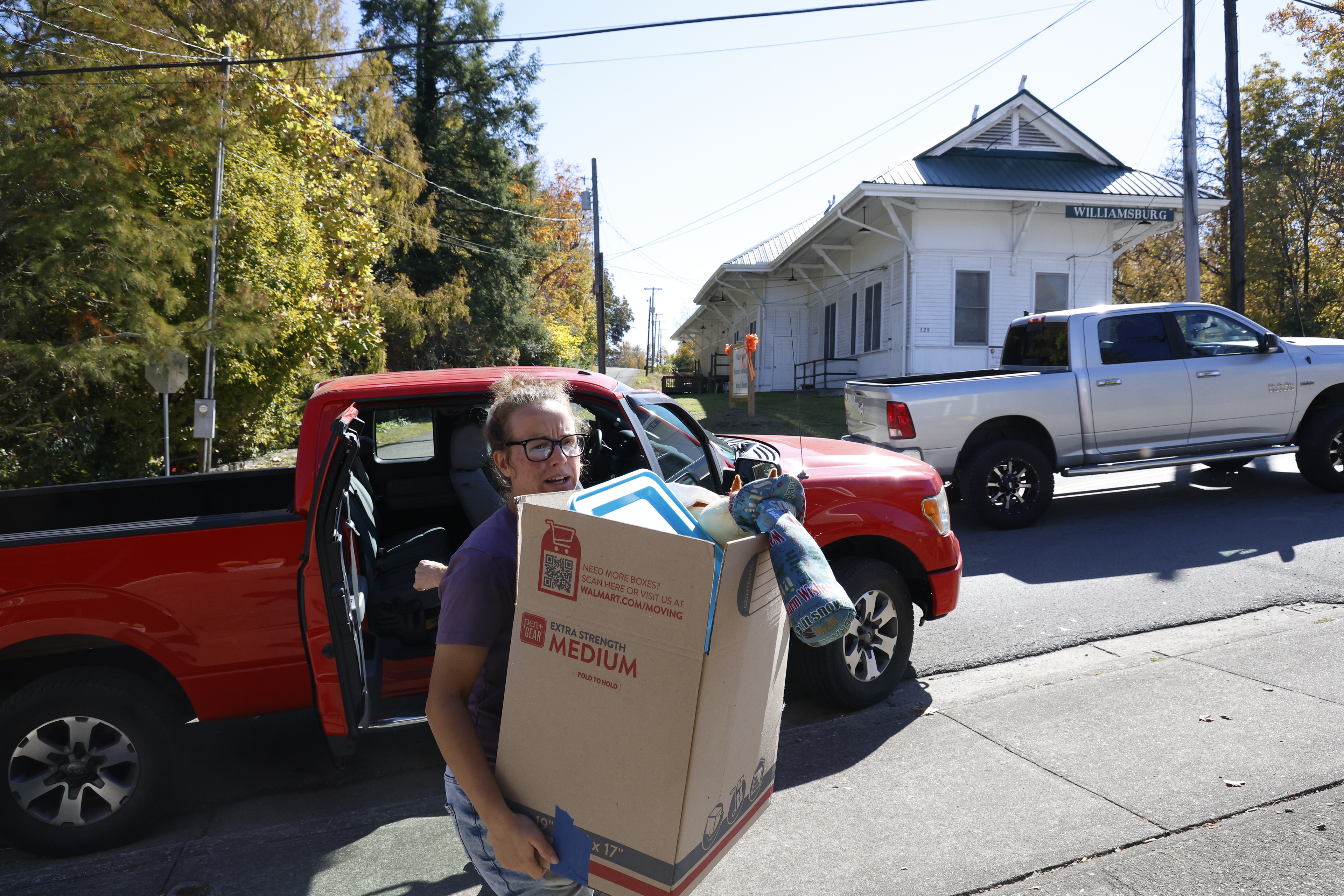 Becca carries donated Christmas items from a donator's truck into the Friendship Center. The center helps local people in need with food and other necessary items.