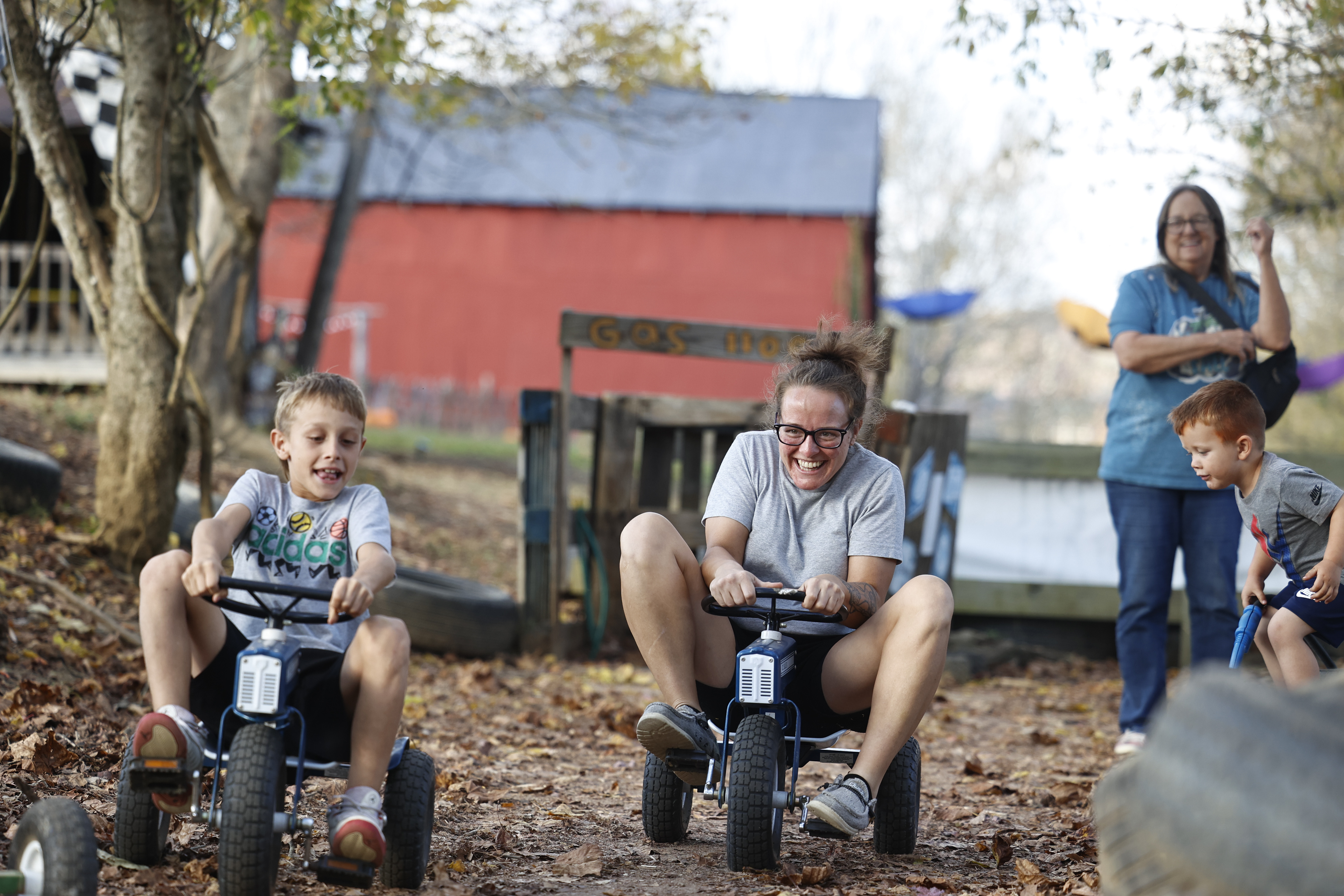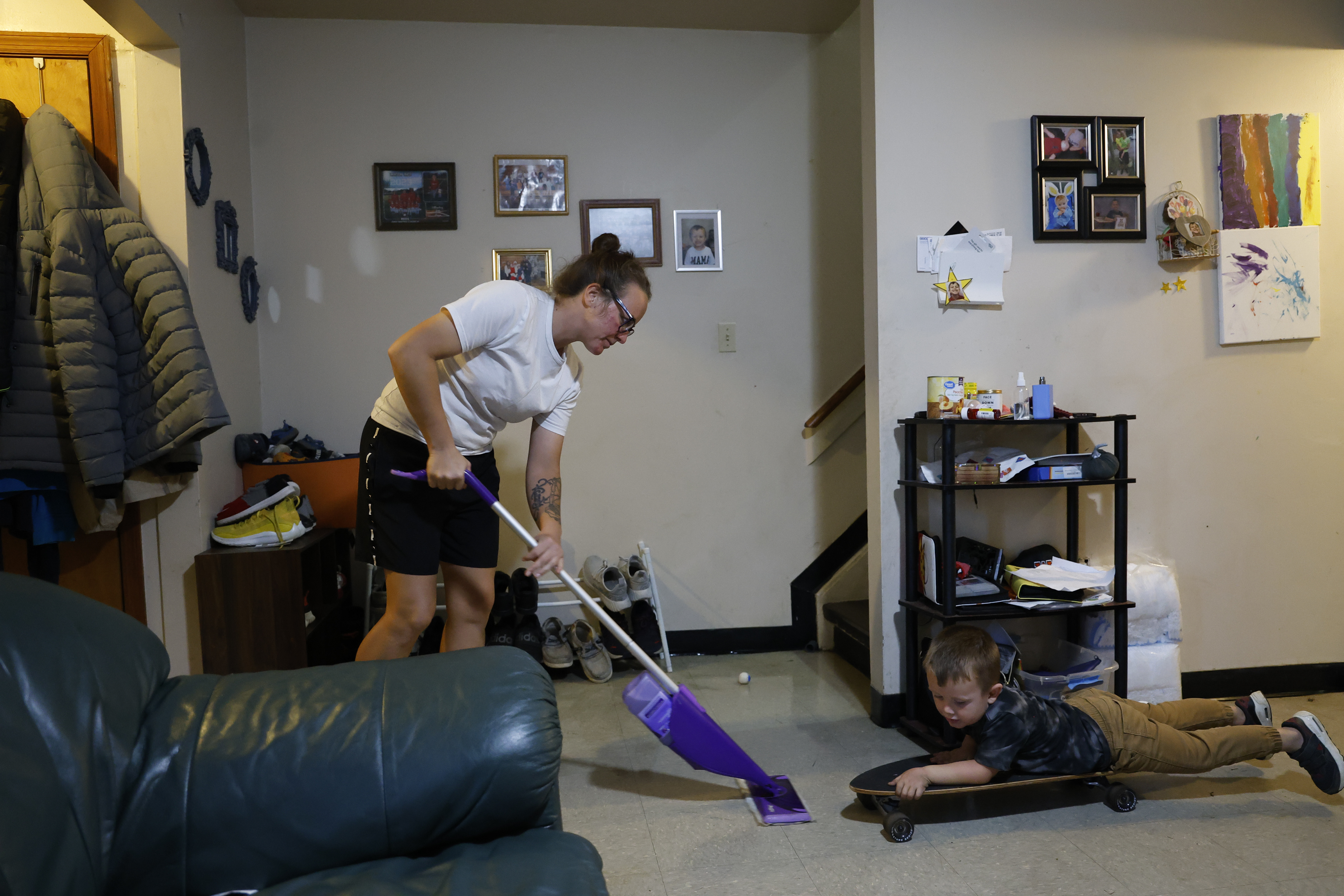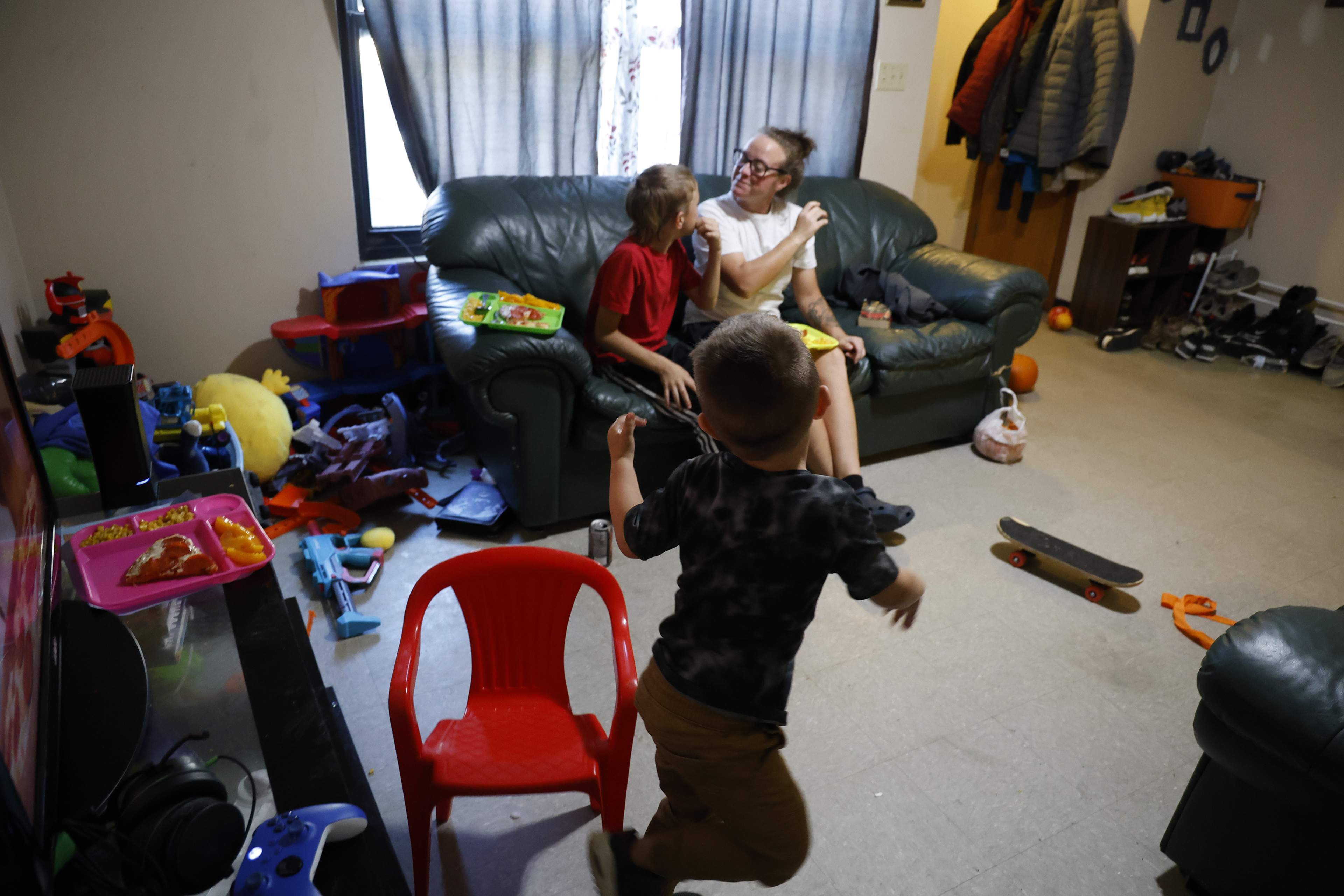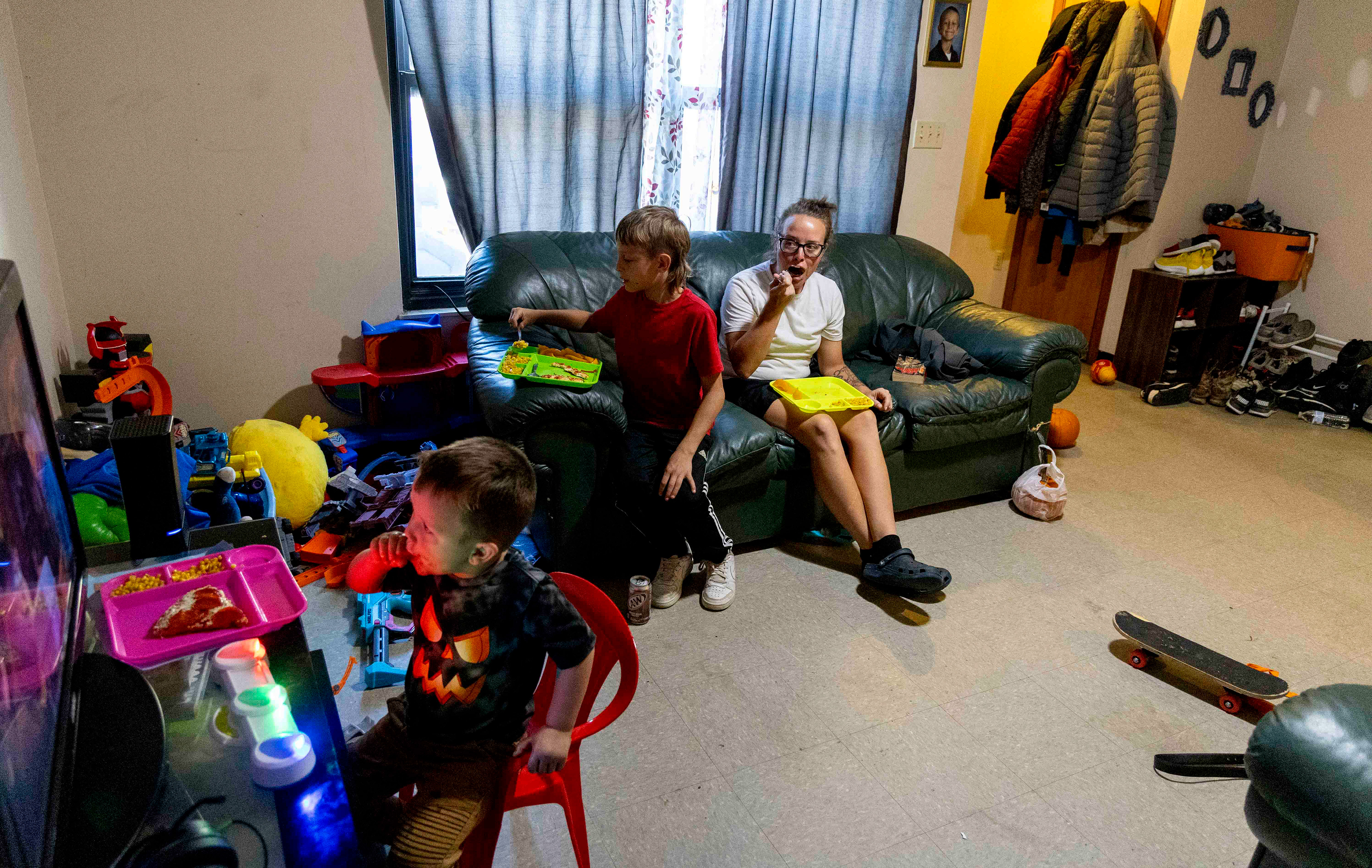 Becca Rice (center) is a single mom of two sons, Mason (left), 9, and Blake (right), 4. A recovering drug addict who has been sober since 2017, she manages a thrift store at the Friendship Center and is studying online for a college degree. Her mother, Darlene Rice (right) is her biggest supporter.