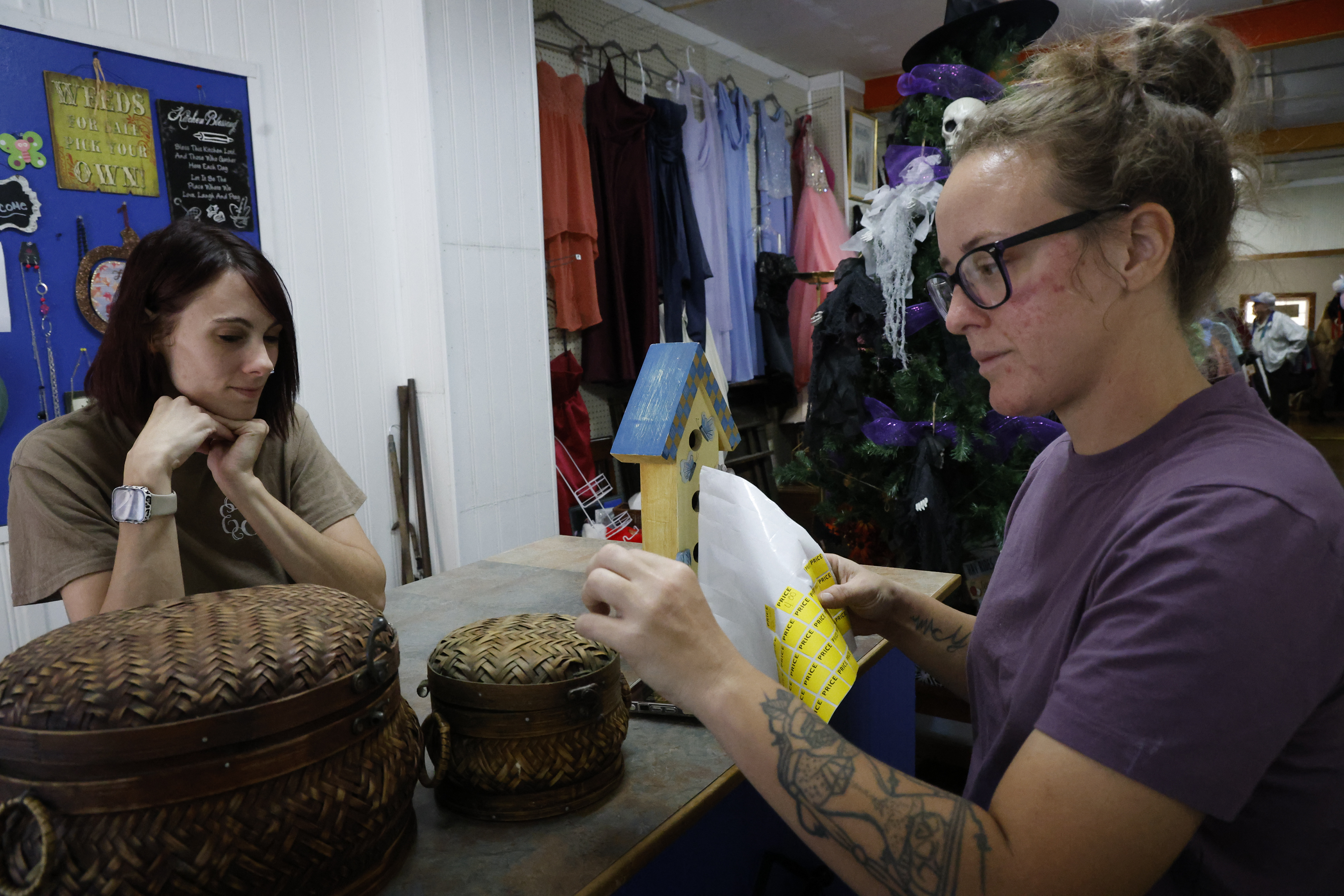 Becca and coworker Meagan Cashion put prices on newly donated items in the thrift store.