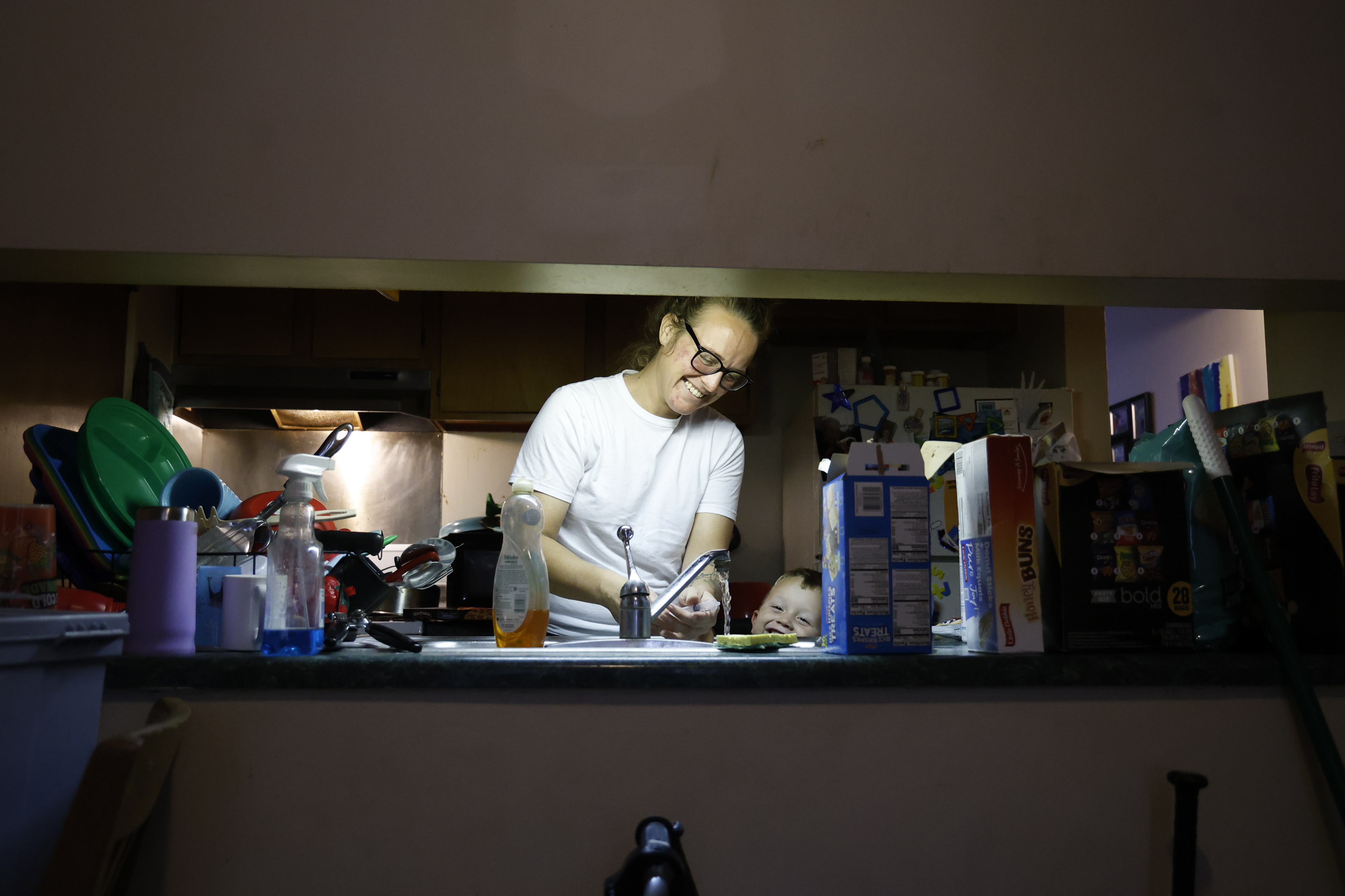 Becca and Blake laugh while she fills a syringe with water for him to squirt before she makes the family dinner.