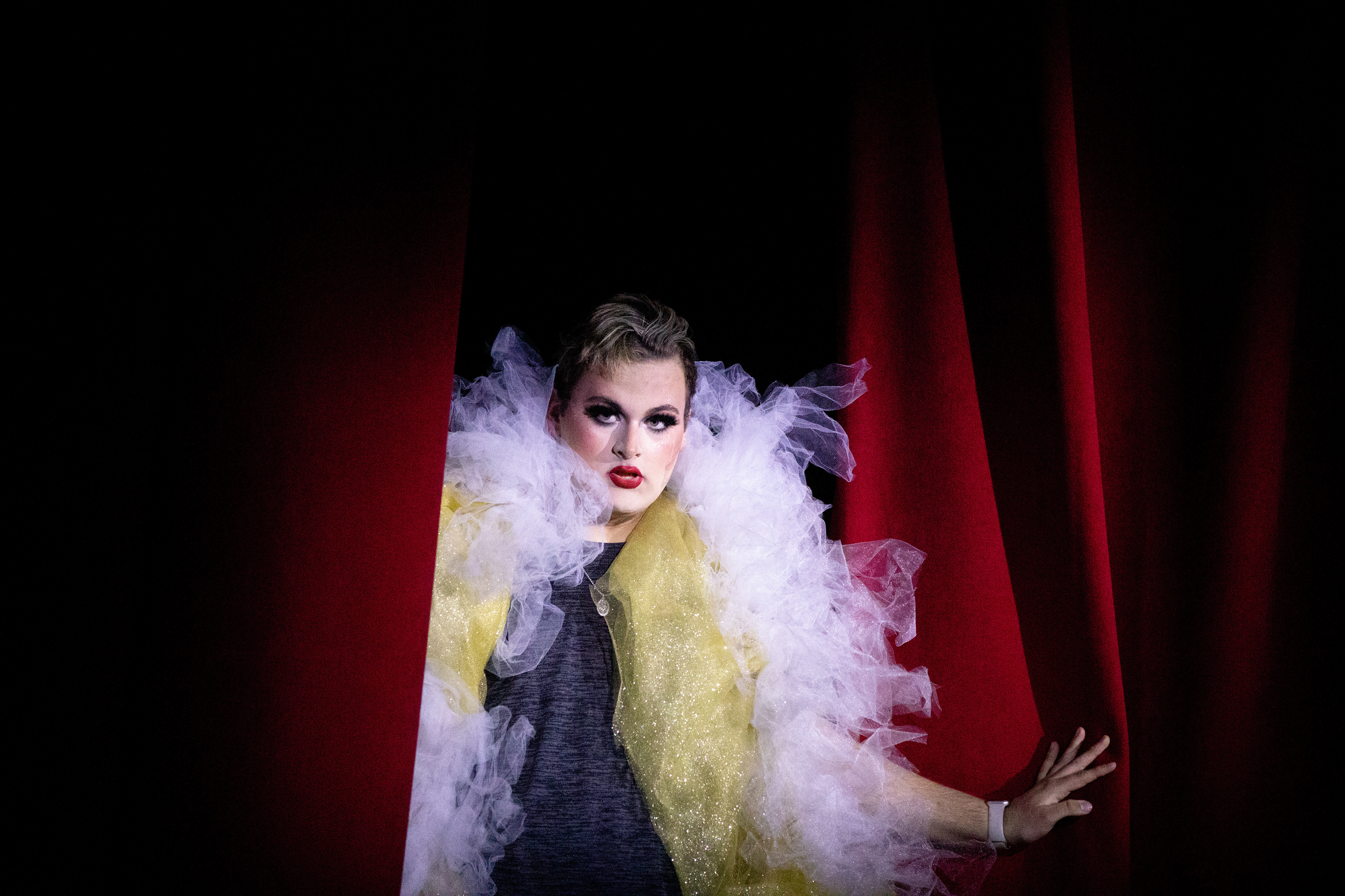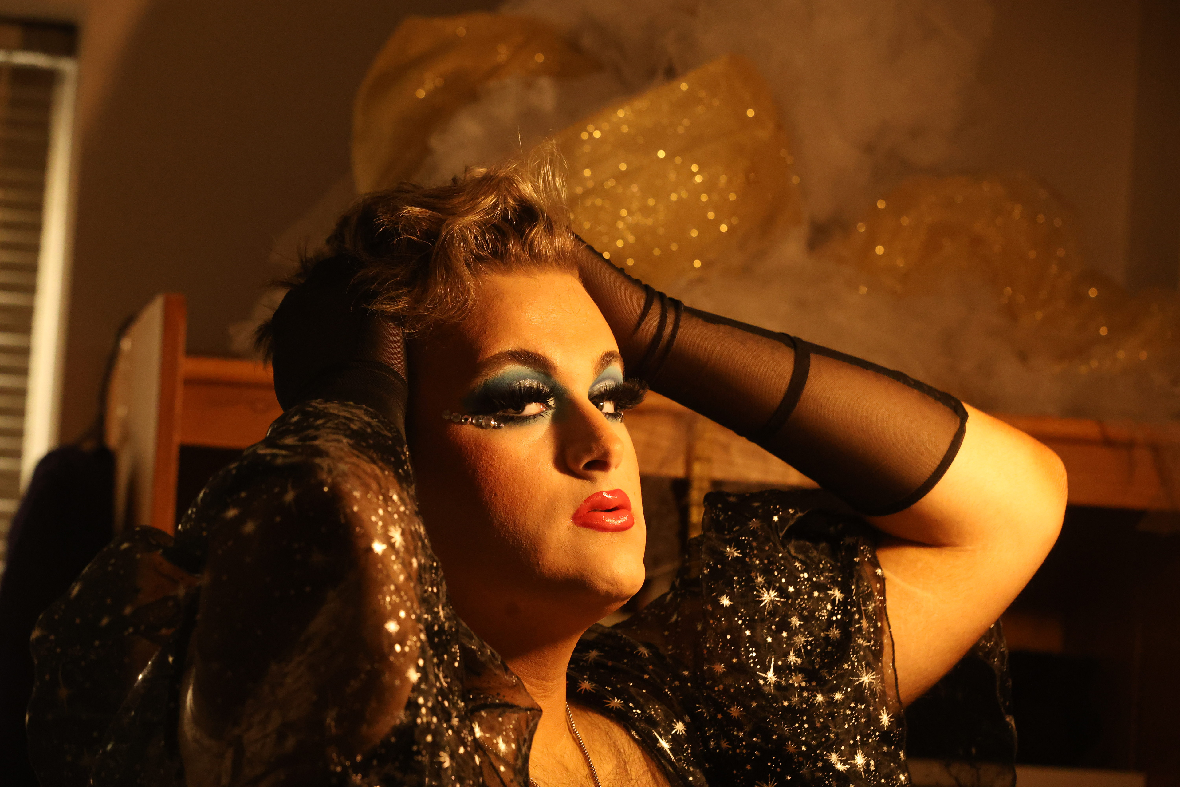 Jacob poses has he finishes getting into drag. He goes under his drag stage name Saphire Sparklez.